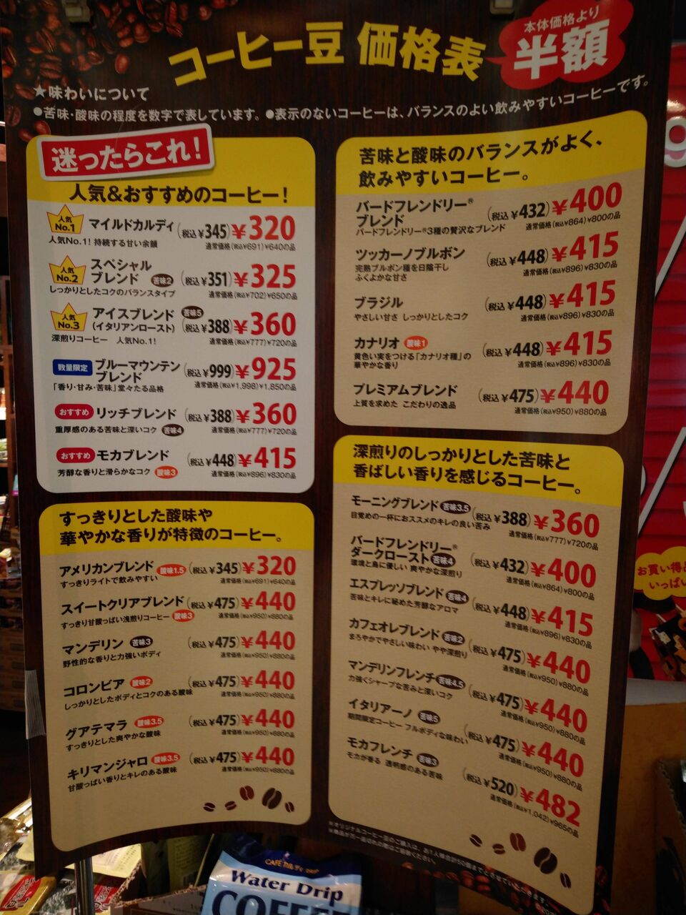 期間限定の豆以外は大体半額だよ