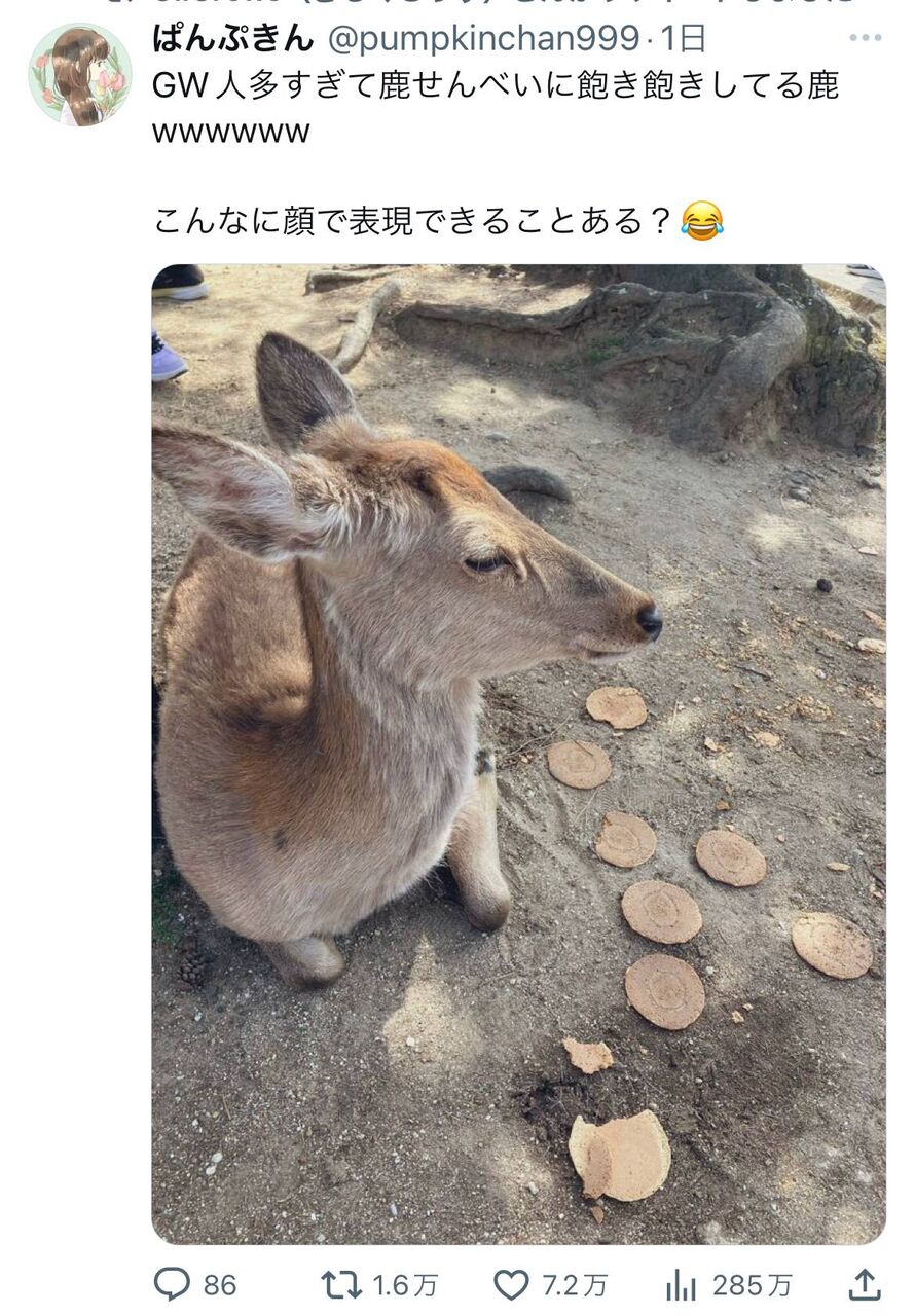 このニュースに思わず笑ってしまいました!鹿せんべいは美味しいのだろうけれど、飽きるほど食べるのはちょっとかわいそうですね。鹿の立場からすると、毎日同じせんべいだとストレスになりそう...